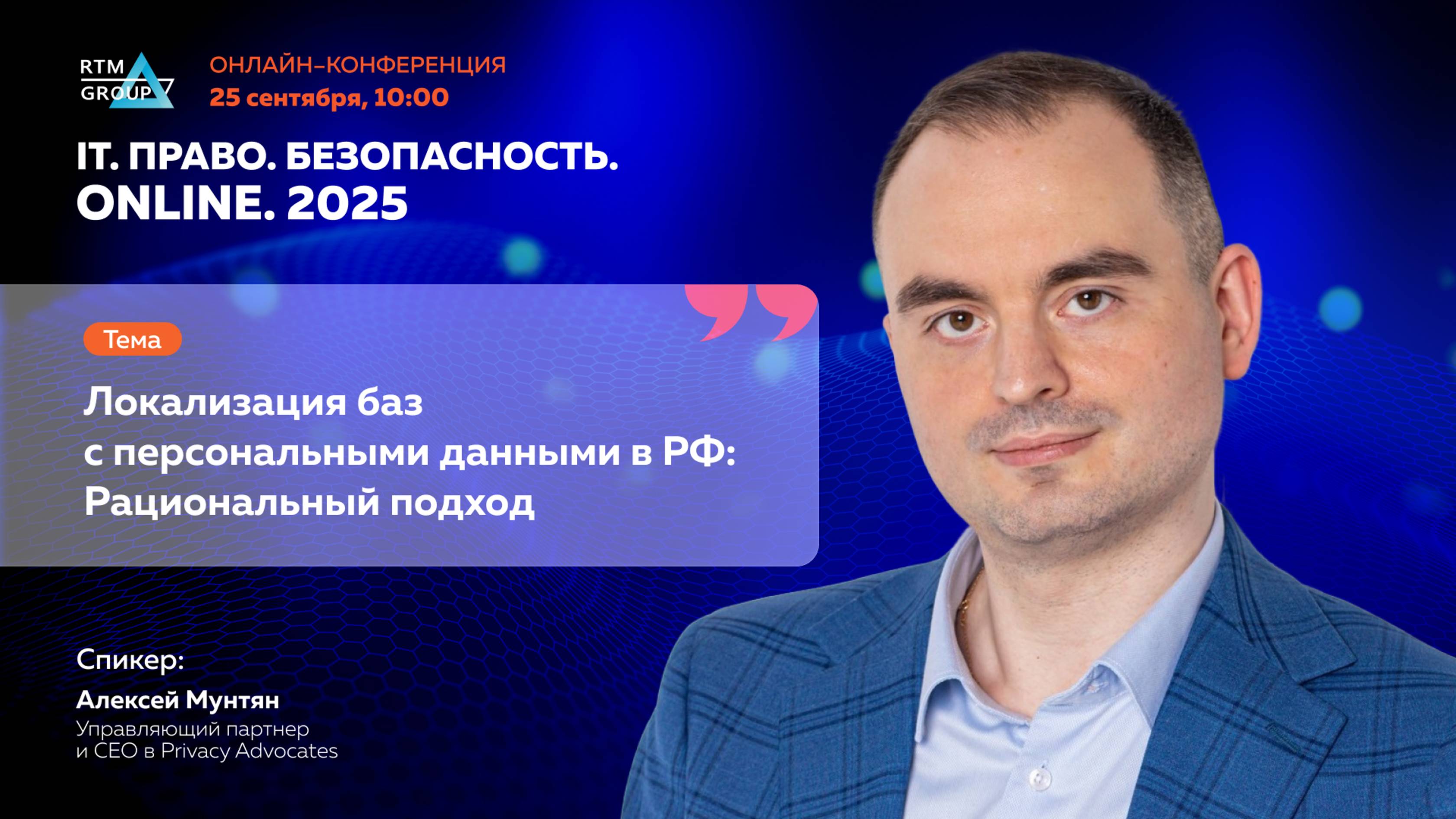 Онлайн-конференция «IT. Право. Безопасность. Online. 2025», объединившая специалистов нескольких отраслей для обсуждения острых тем и практических вопросов ИТ, безопасности и юриспруденции. Тема выступления: Локализация баз с персональными данными в РФ: Рациональный подход Спикер: Алексей Мунтян, управляющий партнер и CEO в Privacy Advocates Сайт конференции: https://itlawsec.ru Организатор конференции: RTM Group Сайт: https://rtmtech.ru/ Наши проекты: Сайт заверения переписки https://approve.rtmtech.ru/ Платформа для автоматического создания пакеты документов по категорирования КИИ, ПДН и повышению осведомленности https://medoed-soft.ru/ Сайт RTM Group — услуги в сферах кибербезопасности, IT и права. Бесплатные вебинары https://rtmtech.ru/ Вопросы можно писать сюда info@rtmtech.ru Больше новостей в ТГ канале https://t.me/it_law_security