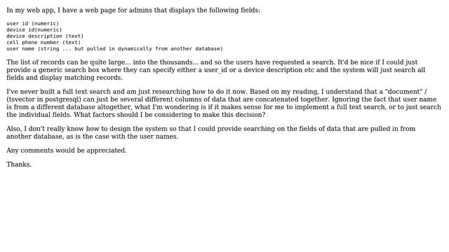 Databases: to use full text search or not? Helpful? Please support me on Patreon: https://www.patreon.com/roelvandepaar With thanks & praise to God, and with thanks to the many people who have made this project possible! | Content (except music & images) licensed under CC BY-SA https://meta.stackexchange.com/help/licensing | Music: https://www.bensound.com/licensing | Images: https://stocksnap.io/license & others | With thanks to user dot (dba.stackexchange.com/users/22371), user Craig Ringer (dba.stackexchange.com/users/7788), user Aaron (dba.stackexchange.com/users/4826), and the Stack Exchange Network (dba.stackexchange.com/questions/52074). Trademarks are property of their respective owners. Disclaimer: All information is provided "AS IS" without warranty of any kind. You are responsible for your own actions. Please contact me if anything is amiss at Roel D.OT VandePaar A.T gmail.com