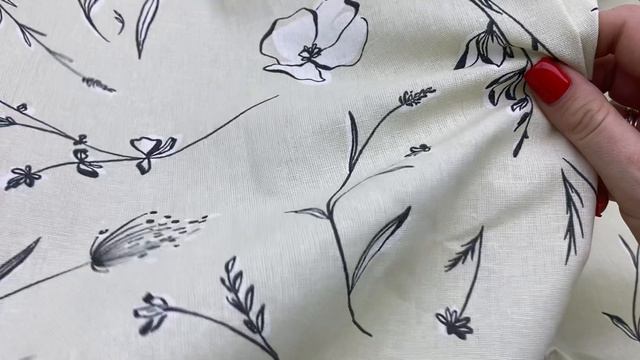 Лён ванильного цвета с принтом чёрные цветочки 20486