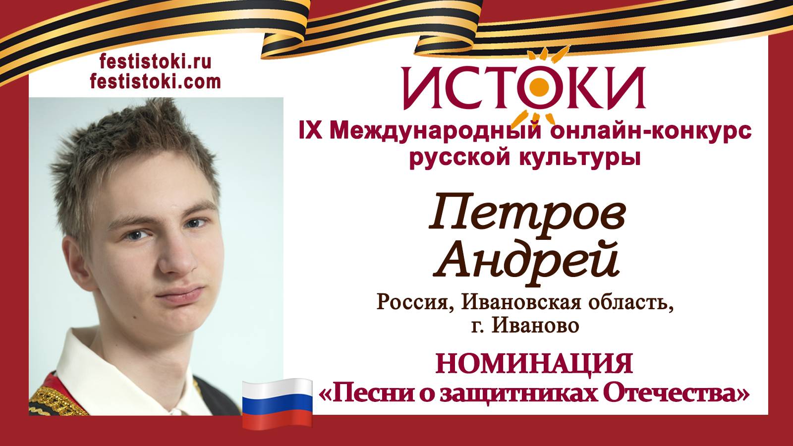 Участник IХ Международного онлайн-конкурса русской культуры "Истоки". Номинация "Песни о защитниках Отечества". Песня "Колоколенка". Автор Леонид Сергеев. Сайт: festistoki.ru / festistoki.com E-mail: festistoki@mail.ru