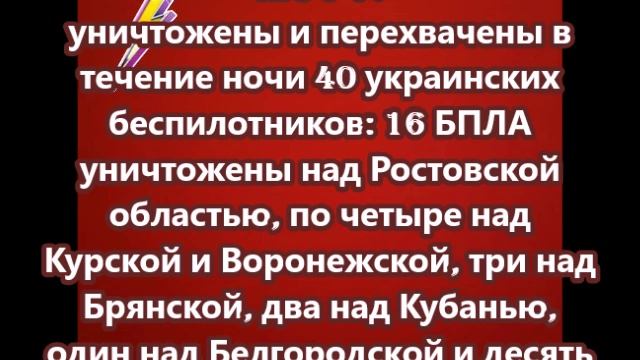 Минобороны РФ сообщило об уничтожении и перехвате в течение ночи 40 украинских беспилотников