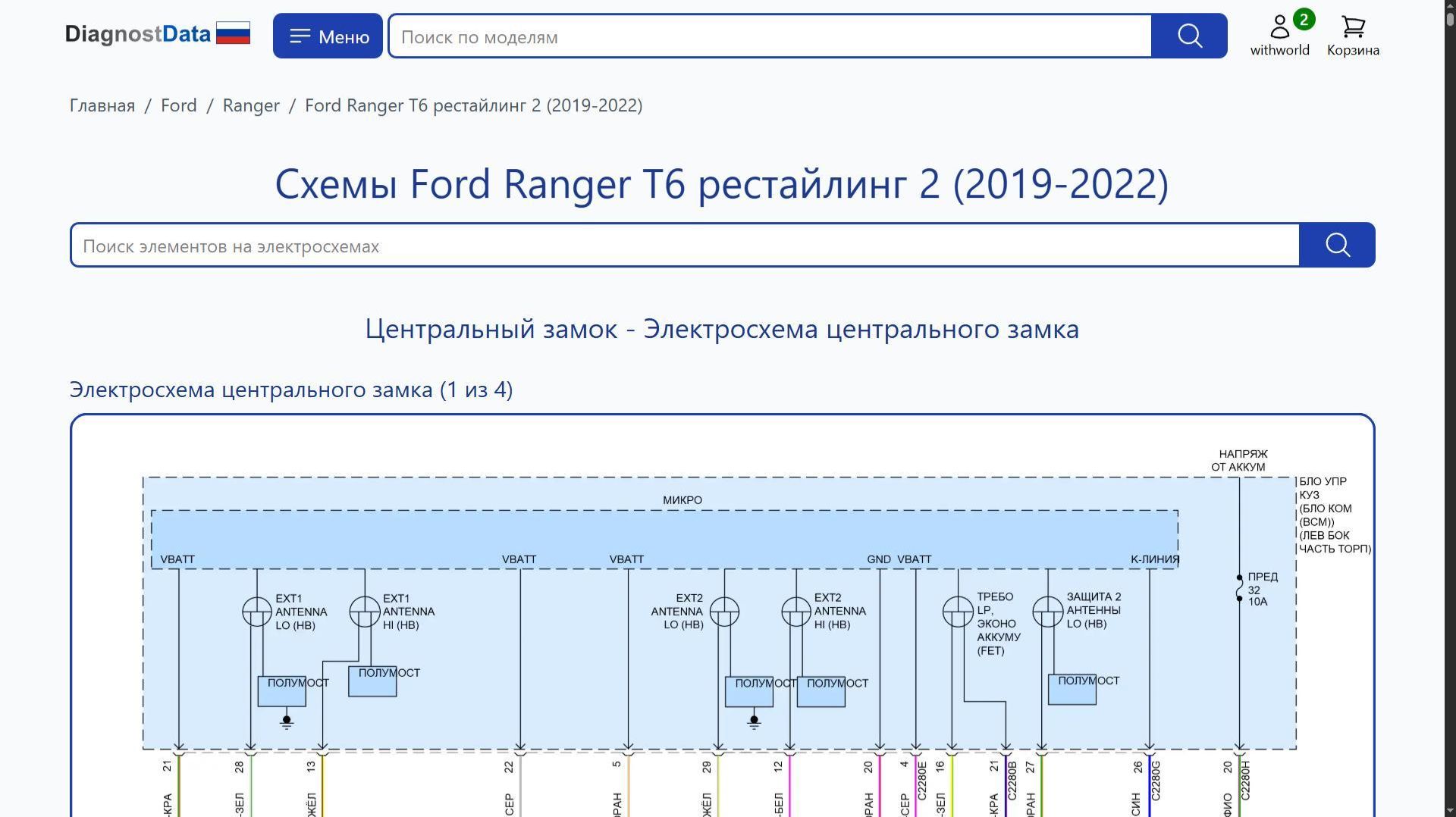 https://diagnostdata.ru/ford/ranger/t6-2-2019-2022/ Электрохемы, распиновки, схемы электропроводки Ford Ranger T6 рестайлинг 2 (2019, 2020, 2021, 2022 годов выпуска) 2.3L TURBO Схемы на русском языке для систем: Схемы Центральный замок, Схемы Системы помощи водителю, Схемы Освещение салона, Схемы Точки подключения масс, Схемы Сиденья, Схемы Блокировка селектора, Схемы Предупреждение, Схемы Блоки управления кузовом, Схемы Фары, Схемы Фары и фонари, Схемы Can шина, Схемы Магнитола, Схемы Дворники и омыватели, Схемы Сигнализация, Схемы Стартер/генератор, Схемы Блок предохранителей и реле, Схемы Вентилятор охлаждения, Схемы Управление зеркалами заднего вида, Схемы Подогрев стекол, Схемы Подушки безопасности, Схемы Приборная панель, Схемы Коробка передач, Схемы Кондиционирование воздуха, Схемы Стеклоподъемники, Схемы Электроусилитель руля, Схемы Круиз-контроль, Схемы Клаксон, Схемы Антиблокировочная система abs, Схемы Двигатель, и др.