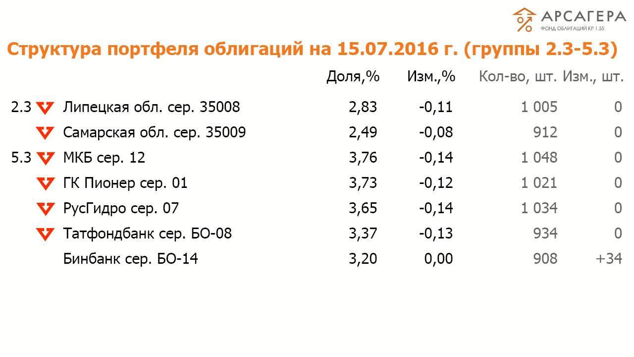 Видеопередача об операциях с активами фонда Арсагера - фонд облигаций КР 1.55 за период с 01.07.16 по 15.07.16 портфель доходность рейтинги СЧА