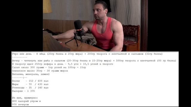 Почти безуглеводная диета для быстрой сушки тела к лету. Не кето диета, а просто очень низкоуглеводная. Углеводов самый минимум. Для меня это наиболее быстрый путь к жиросжиганию. Рацион питания на сушке: Утро или день - 4 яйца (20гр белка и 20гр жира) + 200гр творога с клетчаткой и сахзамом (32гр белка) ---------- Вечер - четверть или рыба с салатом (20-30гр белка и 15-20гр жира) + 500гр творога с клетчаткой (80 гр белка) К творогу идет 250гр кефира в день - 9,5 угл + 10,5 углей в твороге Салат около 300 грамм - 5гр углей на 100гр = 15гр Оливковое масло 30гр - 30 грамм жиров Витамины, минералы, химия) ---------- Белки - 152 / 608 кал Жиры - 70 / 630 кал Углеводы - 35 / 140 кал Калории - 1 378 Из них, примерно: 400 калорий утром и 978 вечером ----- Лично мне, такое питание помогает просушить тело максимально быстро. Сравнивая с другими вариантами сушки, именно питание с количеством углеводов менее 50 грамм в сутки позволяет терять по 1-2 кг в неделю, при выполнении большого количества кардио нагрузок. Если я не делаю кардио, то даже такой рацион будет топить мой подкожный жир очень медленно. А я, все же, хочу в этом году просушить быстро.