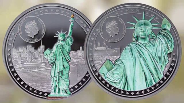 Серебряные монеты 5 и 10 долларов с изображением Статуи Свободы.