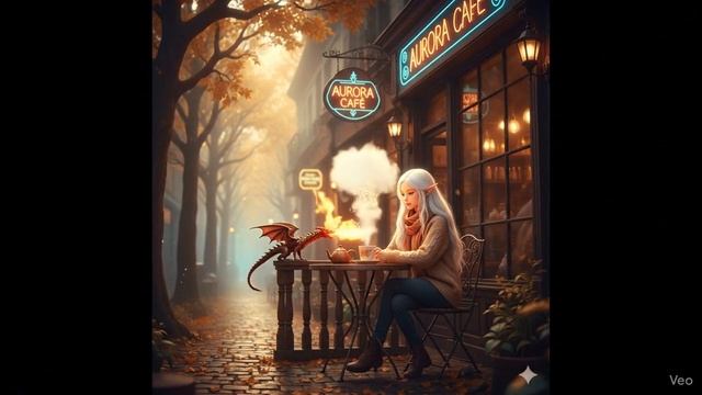 Туманное осеннее утро. Девушка с белыми волосами ставит чашку на холодный мраморный стол у уличного кафе. Из облаков спускается крошечный дракон — его дыхание разогревает кофе, превращая пар в мягкое золото осени. 🍂 Мир замирает, наполняясь теплом легенд. 💫 Благодарим Мафтуну из творческой группы ✨Всё об ИИ в FTT AI✨ за это волшебное утреннее видео!