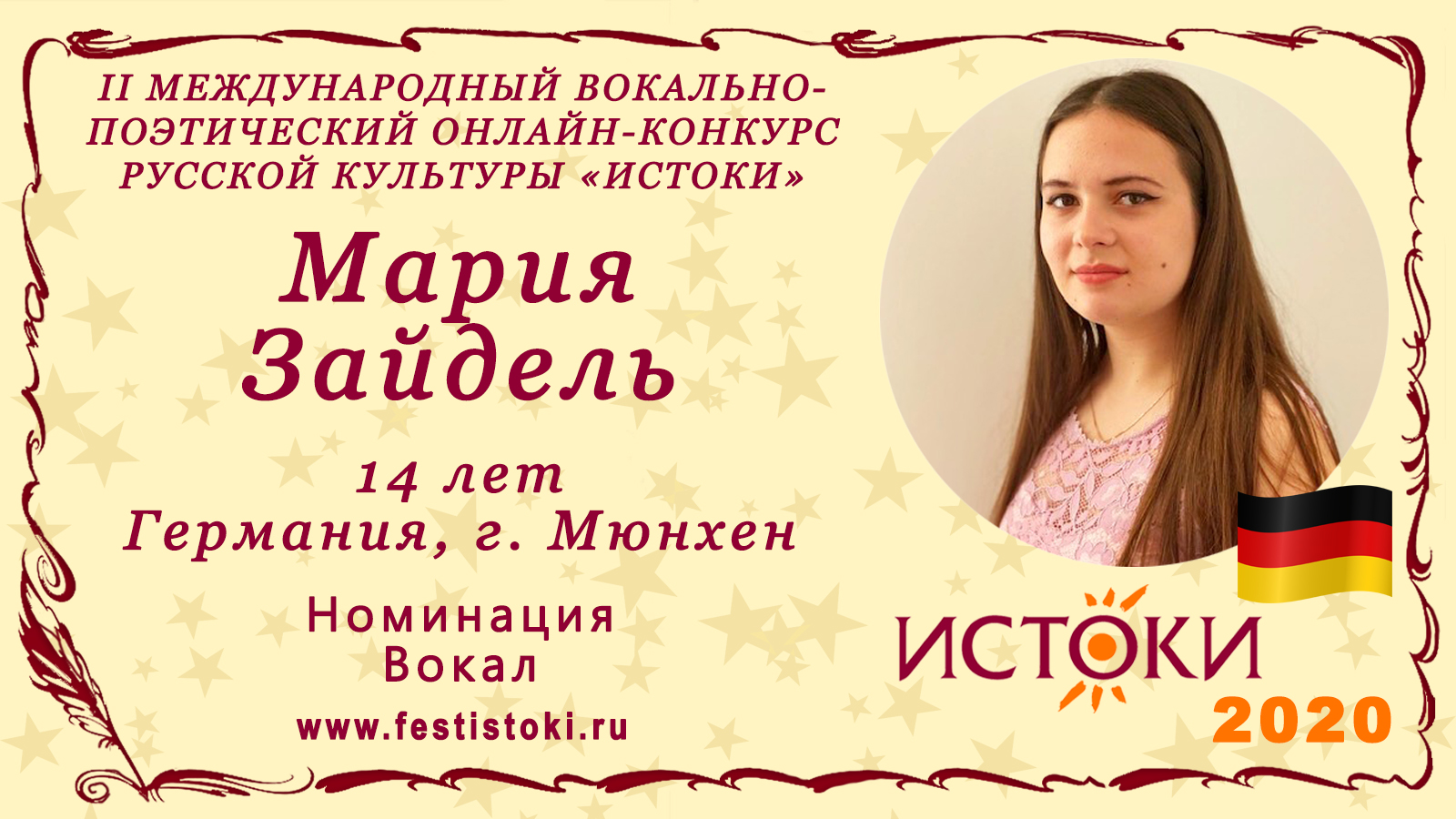 Участник II Международного вокально-поэтического онлайн-конкурса русской культуры «Истоки». Номинация - Вокал. Песня «Красно солнышко». Слова: И. Шаферан. Музыка: П. Аедоницкий. Сайт: www.festistoki.ru / www.festistoki.com E-mail: festistoki@mail.ru