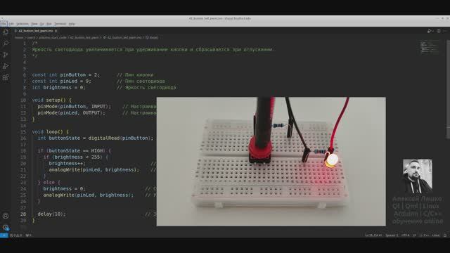 #42 ответ: Яркость светодиода увеличивается при удерживании кнопки и сбрасывается при отпускании.
