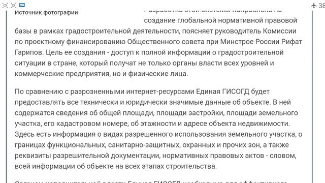 Данные о стройках по всей стране соберут в единой базе С 1 декабря в России начнет действовать Единая государственная информационная система обеспечения градостроительной деятельности (ЕГИСОГД). Решение об этом было принято несколько лет назад, но вступает в силу оно лишь с начала зимы нынешнего года. Разработка этой системы направлена на создание глобальной нормативной правовой базы в рамках градостроительной деятельности, поясняет руководитель Комиссии по проектному финансированию Общественного совета при Минстрое России Рифат Гарипов. Цель ее создания - доступ к полной информации о градостроительной ситуации в стране, который получат не только органы власти всех уровней и коммерческие предприятия, но и физические лица. По сравнению с разрозненными интернет-ресурсами Единая ГИСОГД будет предоставлять все технически и юридически значимые данные об объекте. В ней содержатся сведения об общей площади, площади застройки, площади земельного участка, его кадастровом номере, об этажности и адресе объекта недвижимости. Здесь есть информация о видах разрешенного использования земельного участка, о границах функциональных, санитарно-защитных, охранных и прочих зон, а также реквизиты разрешительной документации, нормативных правовых актов - словом, всей информации об объекте на всех этапах строительства. Органам исполнительной власти Единая ГИСОГД необходима для эффективного осуществления своих полномочий, а гражданам она позволит контролировать соблюдение собственных интересов, отмечает Гарипов. "Инвестор сможет проанализировать инвестиционный проект, проектировщик соберет исходные данные для подготовки проектной документации, собственник здания сможет подготовить документы для юридических действий, связанных с объектом недвижимости. А покупатель сможет проследить путь своей квартиры от котлована до получения ключей", - говорит он. В ЕГИСОГД интегрируют аналогичные региональные системы.