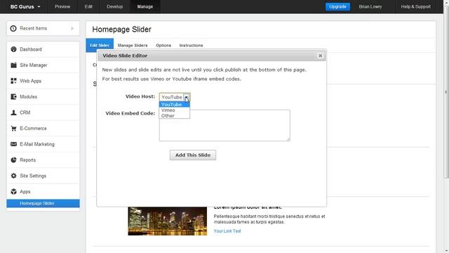 The Solid Home Page Slider App for Adobe Business Catalyst allows any site user to easily control the featured items in their slider with ease. - Use on any BC site plan (including free Creative Cloud accounts, webBasic, and webMarketing) - Responsive - just drop the slider in any responsive page element - Inline Edit - Simlply double-click any slide content to edit - Customize the slider theme with simple CSS - Install sliders on any page by simply inserting a Content Holder - Create Video Slides - Vimeo and YouTube API integration.