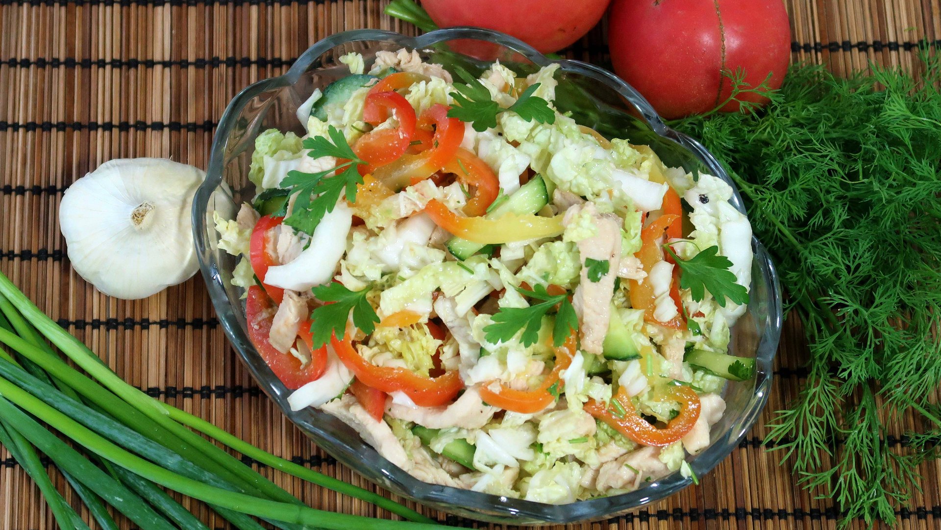 Теплый салат из пекинской капусты с курицей