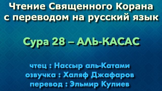 Кира'ат/Чтение с озвучкой Корана Чтец: Насир аль-Катами Озвучка: Халяф Джафаров Перевод: Эльмир Кулиев Источник YouTube канал: " Священный Коран "