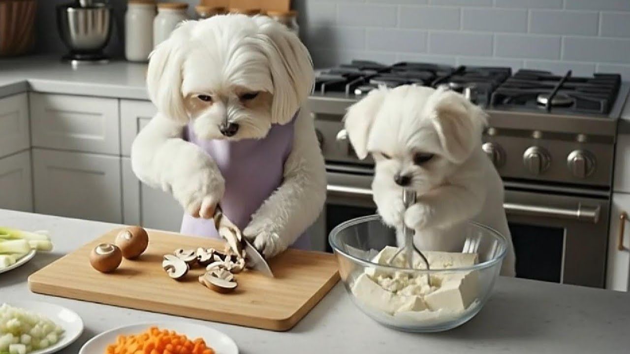 Мама-собака учит малыша-щенка готовить 🧑🍳🍳
