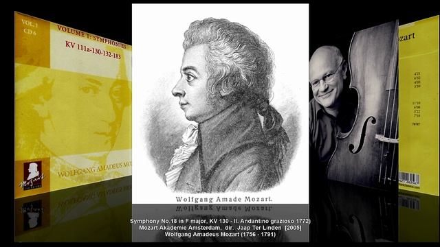 В.А. Моцарт. Все симфонии. Вып. 18-5 Wolfgang Amadeus Mozart (1756 - 1791) – Symphony No.18 in F major, K.130 (1772) Вольфганг Амадей Моцарт (1756 - 1791) – Симфония No.18 фа мажор, KV 130 (1772) F-dur ■ en fa majeur ■ фа мажор I. Allegro [7:44] II. Andantino grazioso [6:53] III. Menuetto [2:27] IV. Molto allegro [7:34] Dirigent: Jaap Ter Linden / дир. Яап Тер Линден Mozart Akademie Amsterdam / Камерный оркестр ` Mozart Akademie Amsterdam` (Recording: August-December 2001, Doopsgezinde Kerk Haarlem, The Netherlands (Recording: Spring 2002, Maria Minor Utrecht, The Netherlands) Симфония №18 фа мажор, К.130, была последней из трех симфоний, сочиненных Вольфгангом Амадеем Моцартом в мае 1772 года, когда ему было шестнадцать лет. Симфония написана для двух флейт, четырех валторн и струнных. В симфонии нет гобоев, они впервые были заменены флейтами. Моцарт также использовал вторую пару валторн во всех частях этой работы, что является редкостью в его творчестве. Симфония состоит из четырех частей: 1. Allegro 4/4 2. Andantino grazioso 3/8 3. Menuetto — Trio 3/4 4. Allegro molto 4/4 . Яп тер Линден (нидерл. Jaap ter Linden, 10 апреля 1947, Роттердам) — нидерландский виолончелист, гамбист, дирижёр, представитель движения аутентичного исполнительства. Главный виолончелист Musica Antiqua Köln, The English Concert, Амстердамского барочного оркестра. Создал ансамбль Musica da Camera (вместе с Тоном Копманом), оркестр Моцартовская академия (2000). Выступал с известными ансамблями барочной музыки, дирижировал рядом оперных спектаклей (Король Артур Пёрселла, Ифигения в Авлиде Глюка). Играл в ансамблях с такими мастерами, как Элизабет Уоллфиш, Эндрю Манце, Джон Холлоуэй, Ларс Ульрик Мортенсен, Тон Копман. Играет на виолончели работы Джованни Гранчино (Милан, 1703). В репертуаре музыканта, в основном, музыка эпохи барокко — Гендель, Бах, Букстехуде, Телеман, Гайдн, Вивальди, Джеминиани, Верачини, Корелли, Шарпантье, Куперен, Леклер, Маре, Моцарт, Хеллендал и др. Также исполнял произведения Бетховена, Вилла-Лобоса. Преподает в Гаагской консерватории, Амстердамской консерватории, Высшей школе старинной музыки в Вюрцбурге. Среди его учеников известная немецкая исполнительница на виоле да гамба Хилле Перл.