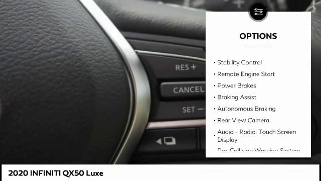 2020 INFINITI QX50 Luxe http://roswellINFINITI.com For more information on this vehicle and our full inventory, call us at 770-625-8500 Roswell INFINITI of North Atlanta 11405 Alpharetta Hwy Roswell GA 30076 Luxe. Navigation Package, Heated Seats, Premium Paint, Cargo Package, Illuminated Kick Plates, Welcome Lighting, Splash Guards.