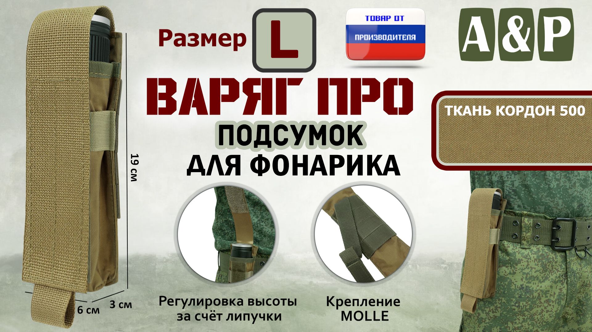 Заказать подсумок Варяг ПРО для фонарика, а также другие аксессуары можно на официальном сайте компании А&Р Групп: https://ap-group-llc.ru/ Возможность изготовления товаров по индивидуальным размерам и проектам. Гарантия на продукцию 1 год. Доставка осуществляется по всей России, а также в Казахстан и Беларусь. _______________________________________________________________________ Мы ВКонтакте: https://vk.com/apgroup Мы на Wildberries: https://www.wildberries.ru/seller/198927 Мы на Ozon: https://www.ozon.ru/brand/a-p-87358243/ Мы на Я.Маркете: https://market.yandex.ru/business--a-r-grupp-rossiiskii-proizvoditel-aksessuarov/864809