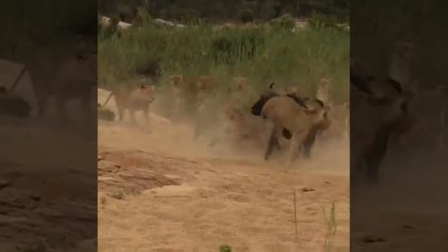 Сдесь показывают,как львицы тихо,спокойно лакомились и вдруг подошёл огромный буйвол и учидал,что они лакомятся его товарищем и буйвол начал пырять львицу и крутить её на рогах.