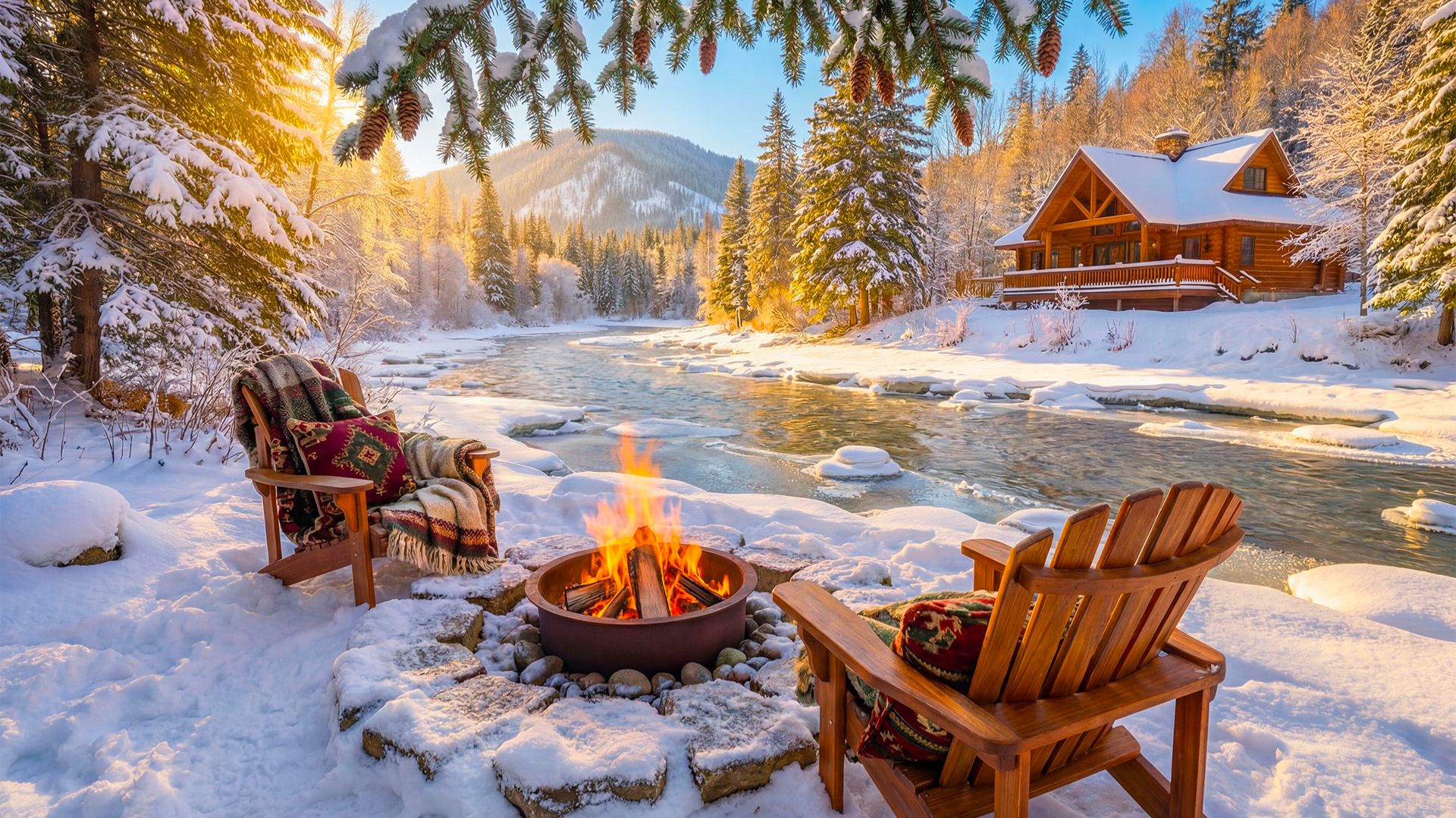 Идеальное Зимнее Утро у Костра ❄️ Домик у Реки, Потрескивание Огня | Звуки Природы