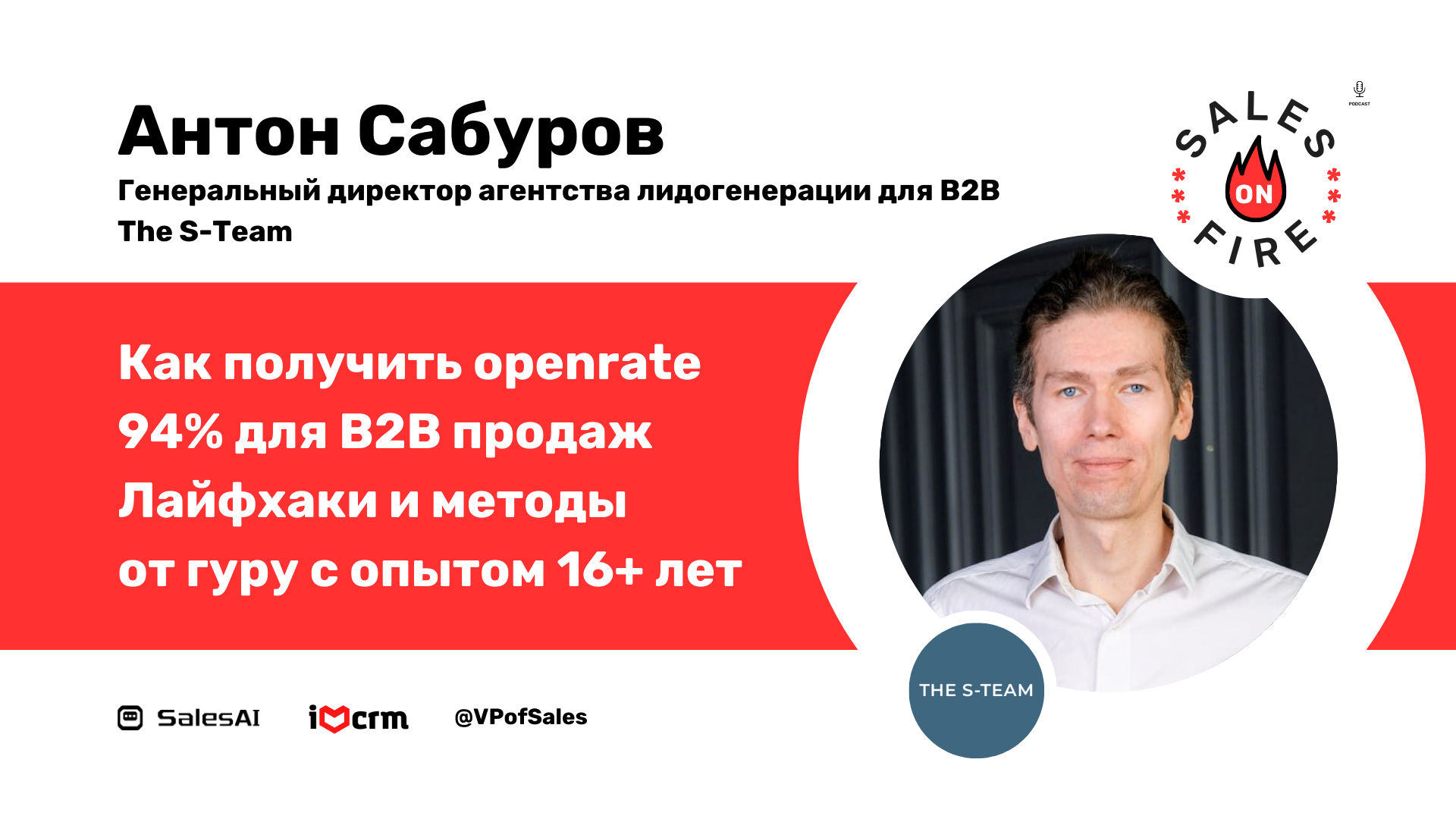 Как получить open rate 94% для B2B: лайфхаки от гуру с опытом 16+ лет / Антон Сабуров E-mail маркетинг скорее жив или скорее мертв? Споры об этом идут много лет и не утихают до сих пор. Но я вам вот что скажу: если вы считаете, что он мертв - вы просто не умеете его готовить. Можно спалить свой основной домен за месяц, можно купить 10-20 доменов еще. Можно оформить десятки доменов на соседа и заниматься спамом, рискуя нарваться на жалобы и иски... А можно сделать из этого не просто еще один рабочий канал лидогенерации в B2B, но и построить бизнес, продавая свою 16+ летнюю экспертизу на сторону. Вот Антон и рассказал нам о том, как он дошел до жизни такой и проговорился на эйфории о некоторых секретах. Антон Сабуров CEO в The S-Team - агентство по лидогенерации и продажам для B2B. Помог 50 IT-компаниям из России, Европы и Штатов выходить в новые рынки и находить клиентов через cold email outreach. Также Антон ведет телеграм канал https://t.me/promosbr и YouTube канал https://www.youtube.com/antonsaburov Если вы посмотрите этот выпуск подкаста, то узнаете про: 1. Как использовать Тенчат? 2. Где искать контакты? 3. Разница в подходах: Россия, Европа, США? 4. Как выглядит его продукт. 5. Как выглядит его воронка продаж. 6. Как сделать открываемость 94%. 7. Какие инструменты он использует? 8. Как делать АВМ и сколько недель до первых SQL. 9. В каких индустриях он работает. 10. Как сделать 1М просмотров на Youtube. и тд ---- Ведущие подкаста: Роман Магдаленко и Антон Борода. Партнеры выпуска: * SalesAI — Автоматическая квалификация лида, контроль качества звонков и заполнение CRM с помощью ИИ. https://salesai.ru * VP of Sales — Канал про Data Driven продажи. https://t.me/vpofsales * #IloveCRM — Все, что вы хотели знать про CRM, но стеснялись спросить. https://t.me/ilovecrm ---- #Podcast #Подкаст #ПродаживОгне #SalesOnFire #Sales #Marketing #Продажи #Маркетинг #b2b #лидерство