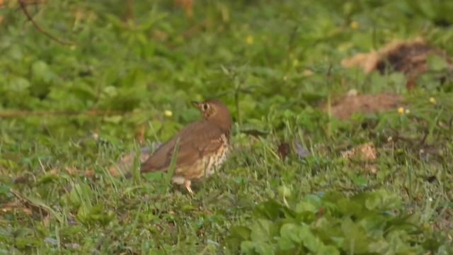 Певчий дрозд ест, наблюдение птиц в Новгородсккой области, Вяжищи, 19 апреля 2025