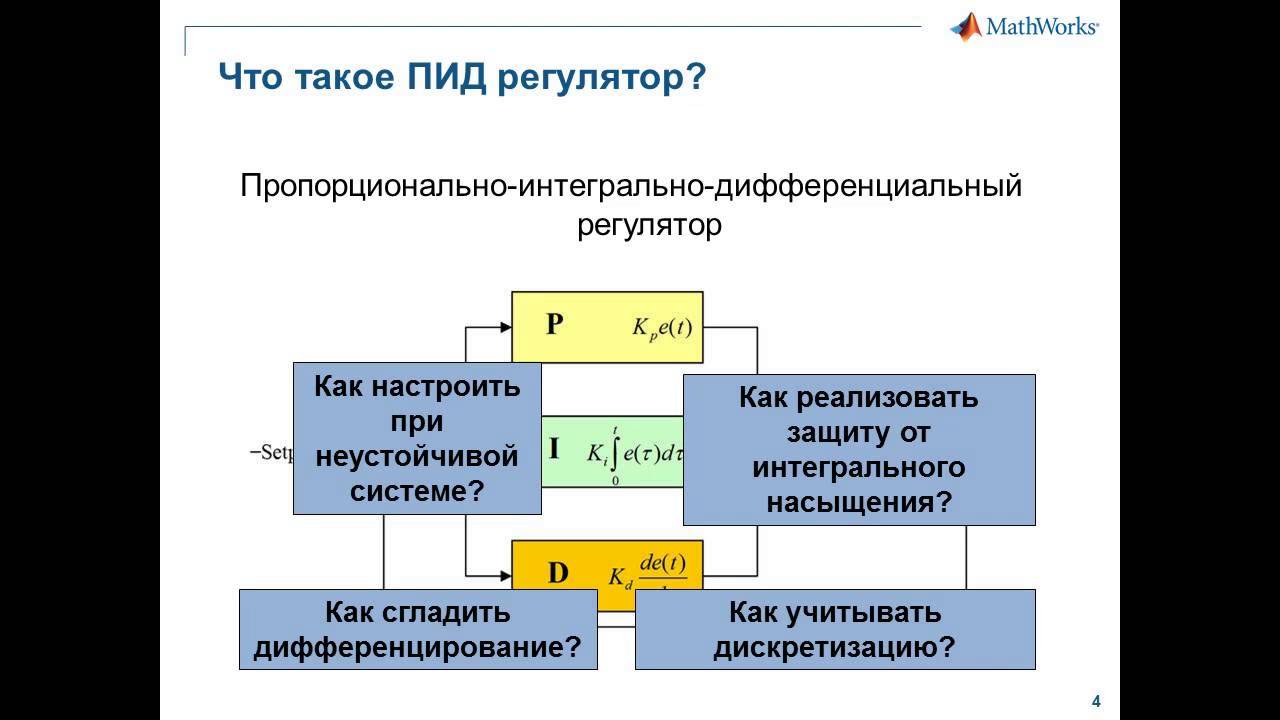 MATLAB https://exponenta.ru/matlab Simulink https://exponenta.ru/simulink Запись вебинара: https://exponenta.ru/events/nastroyka-pid-regulyatora-legko-i-prosto В данном вебинаре будут рассмотрены возможности MATLAB и Simulink для проектирования систем управления и настройки пропорционально-интегрально-дифференциальных (ПИД) регуляторов. ПИД регулятор является самым распространенным видом регулятора. Благодаря своей эффективности и функциональной простоте данные регуляторы находят широкое применение во многих областях, где требуется обеспечивать высокую точность при управлении процессами. Вместе с несложной реализацией алгоритма практическое проектирование регулятора и подбор его параметров требует больших навыков и знаний. В ходе демонстрации Вы узнаете, как можно легко и быстро спроектировать, настроить параметры и обеспечить реализацию ПИД регулятора. Будет показано: • как ПИД регуляторы применяются в различных сферах промышленности; • как сделать переход от непрерывной реализации алгоритма управления к дискретной; • как учесть насыщение выходного сигнала устранить эффект интегрального насыщения. Проект «Карьера» - вакансии для разработчиков и инженеров: https://hub.exponenta.ru/career Подписывайтесь на наши группы: FACEBOOK ‣ https://www.facebook.com/Matlab.Russia VK ‣ https://vk.com/mathworks INSTAGRAM ‣ https://www.instagram.com/matlab_russia/ Telegram ‣ https://t.me/exponenta_ru