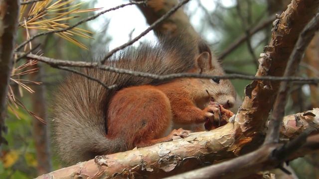 У белок есть хорошая привычка делать запасы. Конечно они не всегда находят спрятанную еду, особенно закопанную в землю. Но очень часто они прячут вкусняшки и на ветках деревьев и с аппетитом ими лакомятся.