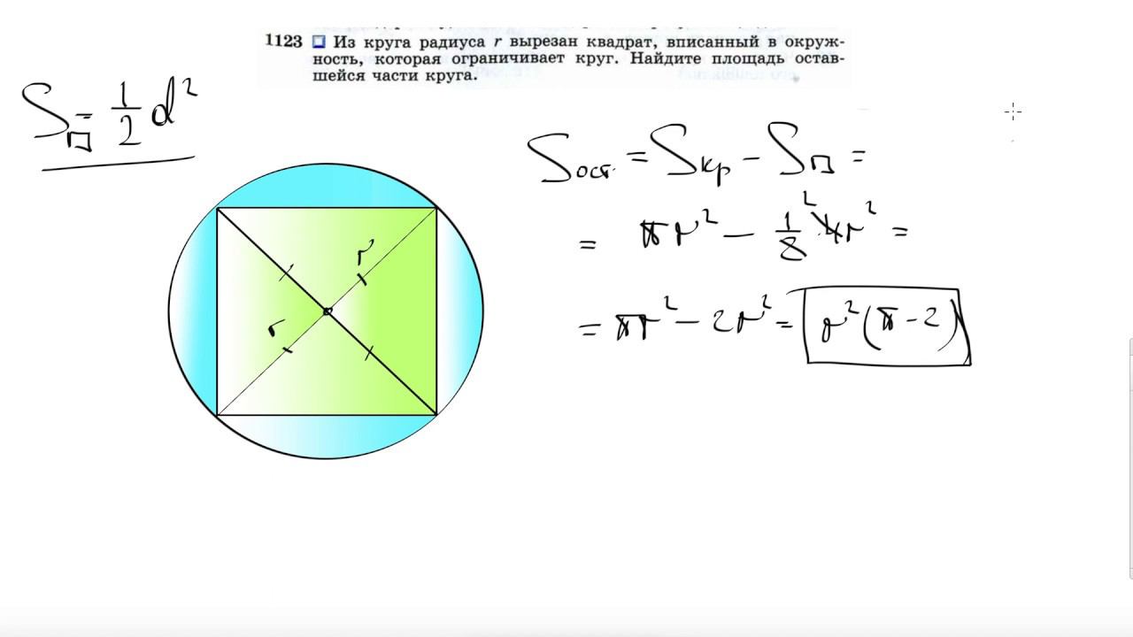 №1123. Из круга радиуса r вырезан квадрат, вписанный в окружность, которая ограничивает круг. Найдите площадь оставшейся части круга. Поддержать канал рублём - 5469400944002125 (Сбербанк) TikTok - https://vm.tiktok.com/WJJwK9 Мой второй канал для подготовки к ЕГЭ и ОГЭ - https://www.youtube.com/ЕвгенийСумин Инстаграм - https://www.instagram.com/EGE_OGE.math Личный инстаграм - https://www.instagram.com/ee_sumin VK - https://vk.com/evgeniysumin FB - https://www.facebook.com/EvgeniySumin
