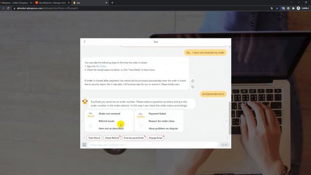 https://h5-global.alimebot.aliexpress.com/intl/index.htm?from=cYFtu2ayEG&hcAppId=1248 Type 'live chat' in the dialog box to get customer service.