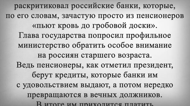 С Пенсионеров СПИШУТ ДОЛГИ по Решению Президента! Президент России Владимир Путин принял новое решение для всех пенсионеров. Глава государства обрушился с критикой на финансовые учреждения нашей страны. Итогом станет грядущее изменение, которое изменит суммы для пожилых граждан. Новое решение коснется всех пенсионеров. Если пожилой человек задолжает банку, пенсионер сможет пройти процедуру банкротства и списания всех долгов по упрощенной схеме. На совещании с правительством Путин раскритиковал российские банки, которые, по его словам, зачастую просто из пенсионеров «пьют кровь до гробовой доски». Глава государства попросил профильное министерство обратить особое внимание на россиян старшего возраста. Ведь пенсионеры, как отметил президент, берут кредиты, которые банки им с удовольствием выдают, а потом нередко превращаются в вечных должников. В итоге им приходится платить определенные суммы до конца жизни. Путин заявил, что необходимо изменить механизм внесудебного списания долгов для пенсионеров. Для этого будут изменены суммы, по которым это делается. Так, максимальный порог будет повышен до одного миллиона рублей, а минимальная сумма долга снизится с нынешних 50 тысяч до 25 тысяч рублей. Помимо этого, пожилые граждане смогут через пять лет повторно обратиться в органы для такого внесудебного проведения для них процедуры банкротства. Сейчас же этот срок составляет десять лет. Ставьте лайк если поддерживаете такое решение Президента и напишите, как ещё, он бы мог помочь и улучшить жизнь пенсионеров?