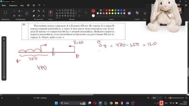 Расстояние между городами A и B равно 470 км. Из города A в город B выехал первый автомобиль, а через 3 часа после этого навстречу ему из города B выехал со скоростью 60 км/ч второй автомобиль. Найдите скорость первого автомобиля, если автомобили встретились на расстоянии 350 км от города A. Ответ дайте в км/ч.