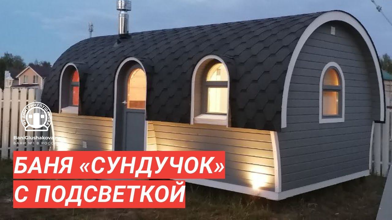 Изюминка этого проекта — фантастическая подсветка. Баня буквально светится в полумраке. Образ дополняют интересные арочные окна и входная дверь. Каркасная сборка, размер 3х6 метров. Объект сдан в конце июля 2021 года. Проект → https://baniglushakova.ru/katalog/sunduchok/sunduchok-karkasnyy-3m-shirinoy/