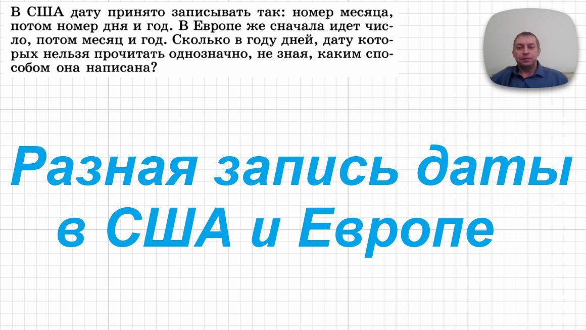 День 31-й. В последний день уходящего года нехитрая задачка про запись даты на американский и европейский манер. ) Для понимания решения нужна логика и вычисления на уровне начальной школы.