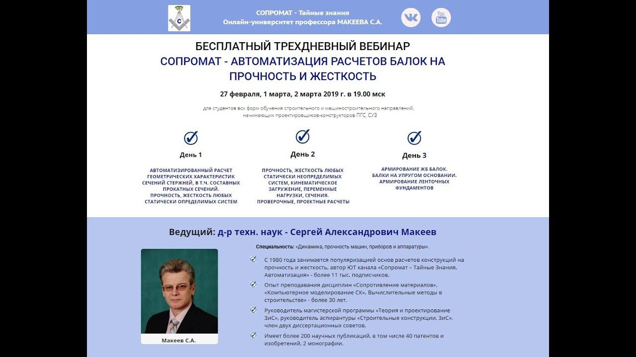 Ссылка на сайт регистрации http://makeev.justclick.ru/vebinar Ссылка на сайт с описанием вебинара http://makeev.justclick.ru/regbespvebMakeevaSA Я, Макеев Сергей Александрович (https://sibadi.org/about/staff/635/), доктор технических наук, приглашаю всех студентов машиностроительного и строительного направлений на освоение практики автоматизации построения эпюр и расчетов на прочность и жесткость балок любой сложности. На вебинаре Вы получите технологию решения статически определимых, любой сложности статически неопределимых балок, балок с упругими опорами, упругой средой (это могут быть ленточные монолитные фундаменты). Будут рассмотрены вопросы практического приложения - автоматизация расчета стальных балок на прочность и жесткость и железобетонных балок, ленточных фундаментов мелкого заложения. Только на вебинаре будут ценные подарки - мои авторские видео разработки по сопромату и МК. Освоение этих материалов дает 100 % уверенность в сдаче экзамена по "Сопромату" и "Металлическим конструкциям, включая сварку". Приходите пообщаемся, будет интересно ...