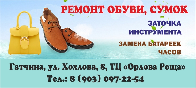 Ремонт обуви, сумок в Гатчине. Замена батареек часов, заточка инструмента. Изготовление ключей и домофонов. - Вставка молнии - Изготовление ключей и домофонов - Накаты, супинаторы - Круговая прошивка - Замена подошвы, каблуков - НАБОЙКИ ЗА 20 МИНУТ! - Замена молний на сумках, ручек - Замена батареек часов - Заточка инструмента Ленинградская область, Гатчинский район, г. Гатчина, ул. Хохлова, д. 8, ТЦ "Орлова роща" Тел.: 8 (903) 097-22-54 Пн-пт 10.00-19.30, сб-вс 11.00-18.30 #ремонтобуви #Гатчина #ремонтсумок #заменабатареекчасов #заточкаинструмента #вставкамолнии #супинаторы #заменаподошвы #заменакаблуков #заменамолнийнасумках #домофоны #ключи #изготовлениеключей #изготовлениедомофонов #сумки #обувь #Ленинградскаяобласть