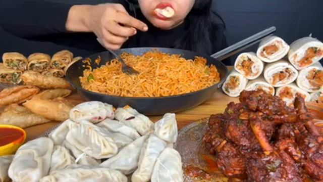 Мукбанг лапша, пельмени, курица Еда на камеру