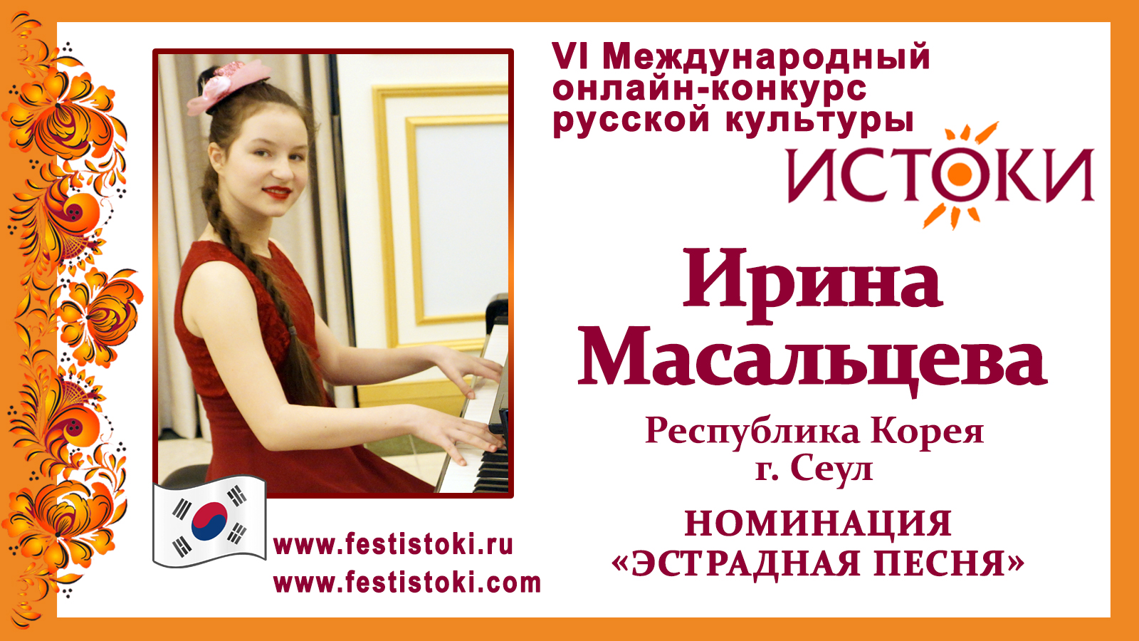 Участник VI Международного онлайн-конкурса русской культуры "Истоки". Номинация "Эстрадная песня". Песня "Старый рояль". Музыка - Марк Минков, слова А. Иванов. Сайт: www.festistoki.ru / www.festistoki.com E-mail: festistoki@mail.ru