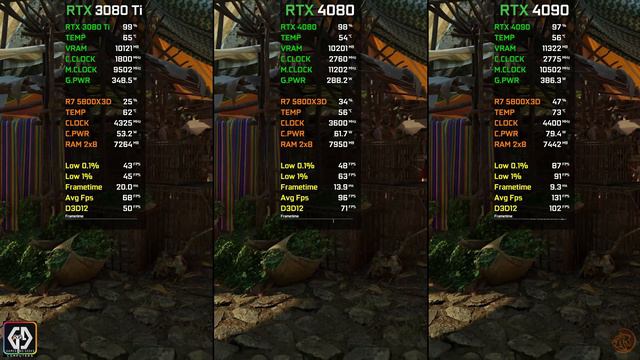 RTX 3080 Ti vs RTX 4080 vs RTX 4090 Ray Tracing & DLSS Performance Comparison at 4K with Ryzen 7 5800X3D Processor ● 00:00 Intro ● 00:13 Sponsor ● 00:18 Cyberpunk 2077 ● 01:36 Marvel's Spider-Man ● 02:27 Control ● 03:32 Shadow Of The Tomb Raider ● 04:46 Far Cry 6 ● 05:41 Dying Light 2 ● 06:38 God of War ● 07:58 Uncharted LoTC ● PC SPECIFICATION ● CPU: AMD Ryzen 7 5800X3D ● Cooler: MasterAir MA410P CPU Air Cooler ● Casing: Cooler Master MasterBox MB511 ARGB Mid-Tower Case ● GPU1: GALAX GeForce RTX™ 4080 16GB SG 1-Click OC ● GPU2: ZOTAC GAMING GeForce RTX 4090 Trinity OC ● GPU3: Palit GeForce RTX 3080 Ti GamingPro 12GB ● MOBO: TUF GAMING B550M-PLUS (WI-FI) ● RAM: VENGEANCE® RGB PRO 16GB (2 x 8GB) DDR4 3600MHz C18 ● PSU: DeepCool DQ850-M-V2L 850W ● OS: Windows 10 Pro 21H2 64 bit ● SSD: Samsung 850 EVO 250GB ● HDD: SEAGATE ST2000DM006 2TB ● Software Use Recording ● Nvidia Shadowplay ● MSI Afterburner - Performance Monitoring ● Nvidia Driver Version 527.56 ● Nvidia Resizable Bar is On Special Thanks To Games And Geeks Computers For Providing these GPUS For The Review. Games And Geeks FB Page: https://www.facebook.com/GAMESANDGEEKSPK ▬▬▬▬▬▬ SUBSCRIBE Here ▬▬▬▬▬▬ ►GamesOracle https://www.youtube.com/c/GamesOracle21 Disclaimer: Copyright Disclaimer under section 107 of the Copyright Act of 1976, allowance is made for “fair use” for purposes such as criticism, comment, news reporting, teaching, scholarship, education, and research. Fair use is permitted by copyright statutes that might otherwise be infringing. #rtx4080 #rtx4090 #rtx3080ti #nvidia #geforce #amd #5800x3d