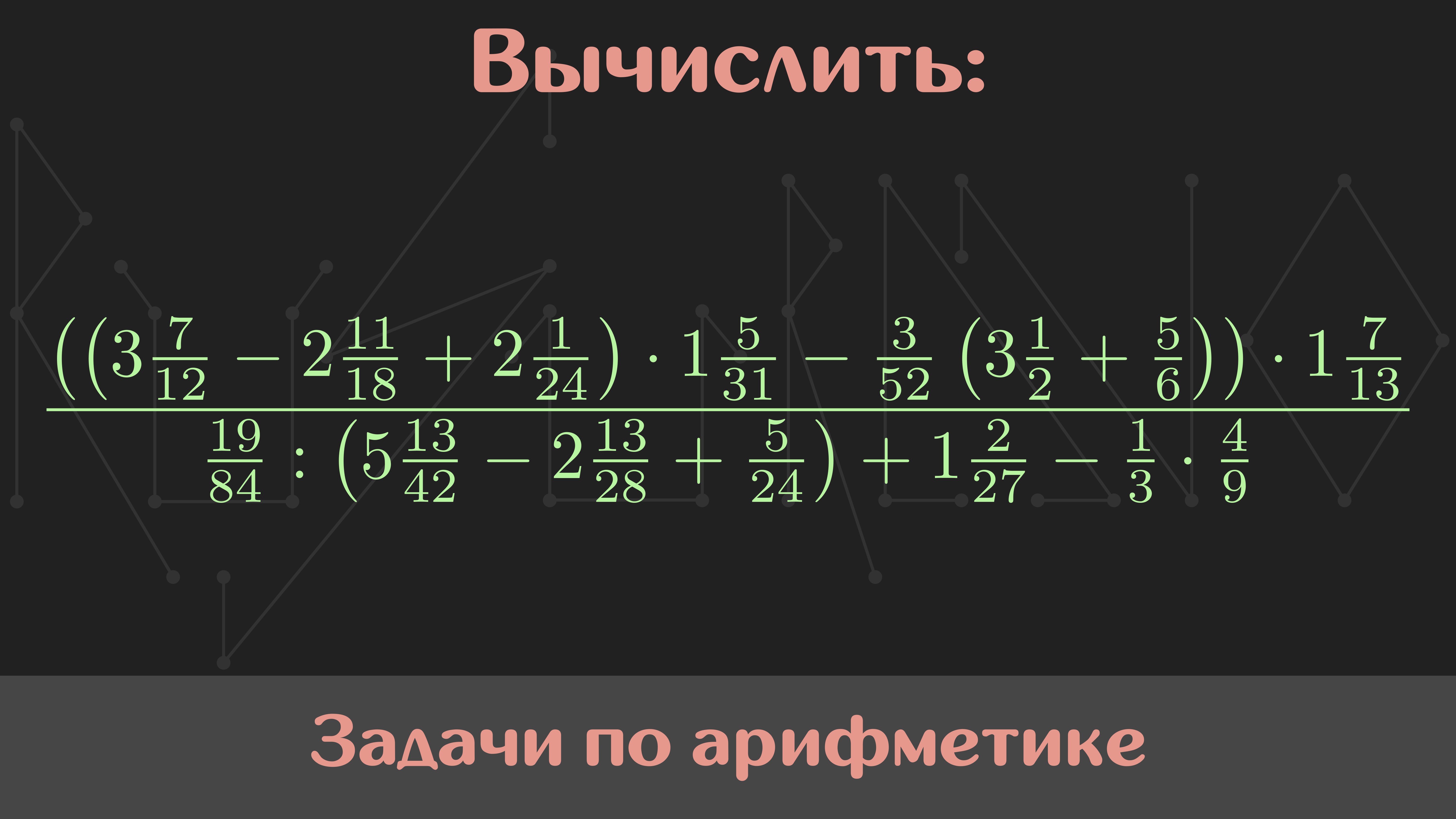 Мой курс по арифметике: https://stepik.org/a/195543 Условие: Вычислить (((3[7/12] - 2[11/18] + 2[11/24]) * 1[5/31] - 3/52(3[1/2] + 5/6)) * 1[7/13]) / (19/84 : (5[13/42] - 2[13/28] + 5/24) + 1[2/27] - 1/3 * 4/9) Памятка: перед просмотром решения задания обязательно попробуйте решить задачу самостоятельно. Так вы научитесь вырабатывать собственный подход к решению. Музыка: Nomyn — Moonlight #Сканави #Арифметика #РешайСоМной #Математика