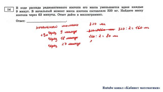 Задание 14. В ходе распада радиоактивного изотопа его масса уменьшается вдвое каждый 9 минут. В начальный момент масса изотопа составляла 320 мг. Найдите массу изотопа через 63 минуты. Ответ дайте в миллиграммах. Курсы для подготовки к ОГЭ и ЕГЭ по математике: https://stepik.org/users/608571559/teach Группа ВК для подготовки к ОГЭ: https://vk.com/secretroom2023 Подготовка к ОГЭ по математике