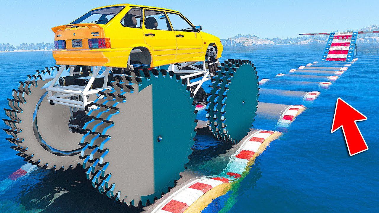 ПРОЕХАЛ ВОДНЫЕ КОЧКИ на ГИГАНТСКОМ ВАЗ 2114 С ПИЛАМИ в ГТА 5 МОДЫ - ЭКСПЕРИМЕНТЫ в GTA 5 MODS