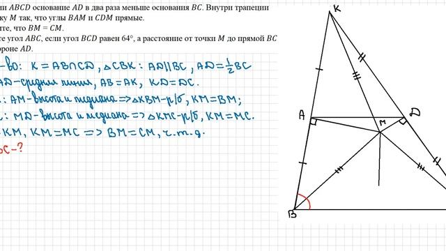 В трапеции основание в два раза меньше основания . Внутри трапеции взяли точку так, что углы и прямые. а) Докажите, что = . б) Найдите угол , если угол равен 64°, а расстояние от точки до прямой равно стороне .