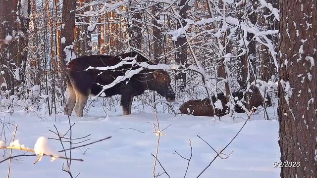 2026/2/5: Лось-5-летка и светло-коричневая лосиха в зоне отдыха "Лесная" напротив магазина "Караван"