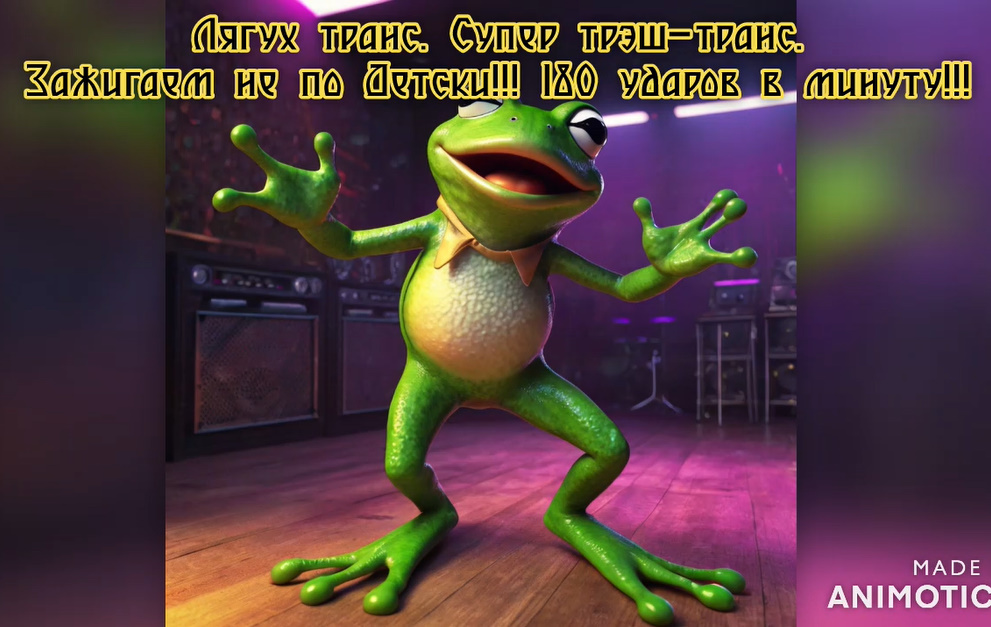 Это зелёное чудо, Вас увлечет трансом. Хит предлагает "авансом"… Ритм задаёт круто. Друзья!!! Сегодня по плану что-то юморное должен был опубликовать, анекдоты, шутки, но у меня такой неожиданный транс экспромт родился. Музыка чума вышла. 100 % Хитяра. А для видео образ, мне показалось лучше сделать лягушку. Точнее Лягуха. Он такой зажигательный, и яркий. По Доброму. Встречайте, Руки Вверх, этот транс дарит Успех!!! Хит года. #транс #лягух #хит #музыка #трэш #дискотека #забой #рукивверх #танец #супер #круто #движение #талант #лучшее #успех #позитив #рекомендации #топ #тренды
