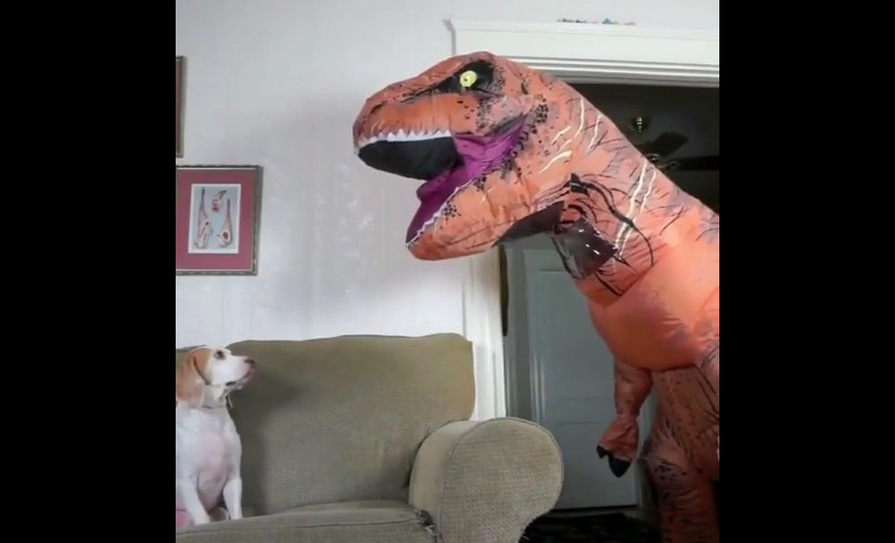 Мужик в костюме Тираннозавра играет с с собакой.
