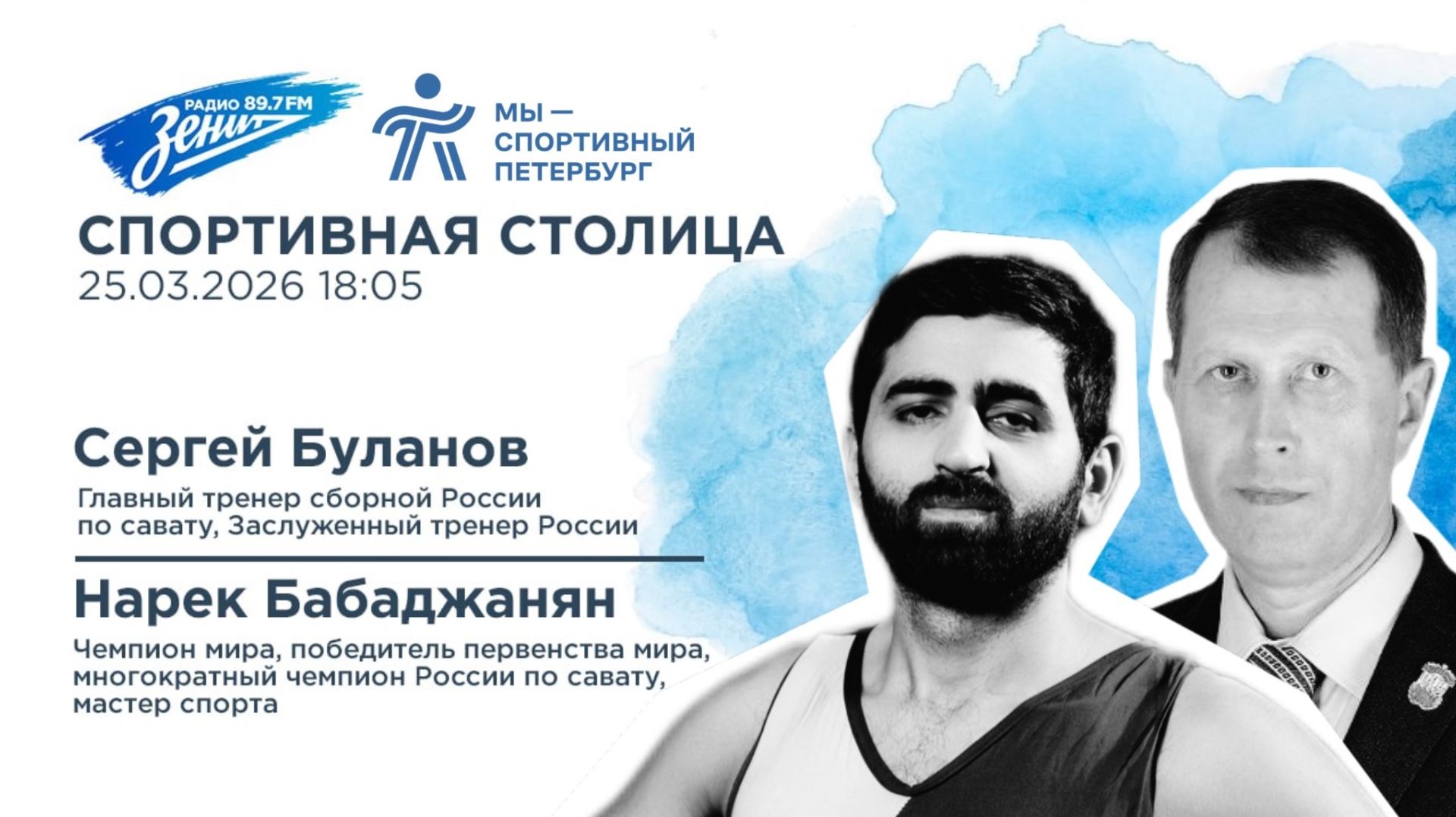 «Спортивная столица». В студии побывают Сергей Буланов, главный тренер сборной России по савату, Заслуженный тренер России и Нарек Бабаджанян, чемпион мира, победитель первенства мира, многократный чемпион России по савату, мастер спорта.