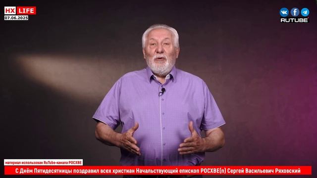 С Днём Пятидесятницы поздравил всех христиан Начальствующий епископ РОСХВЕ(п) Сергей Васильевич Ряховский Ссылка: https://rutube.ru/video/fb354492014f5de7153d7f20a8ef180a/