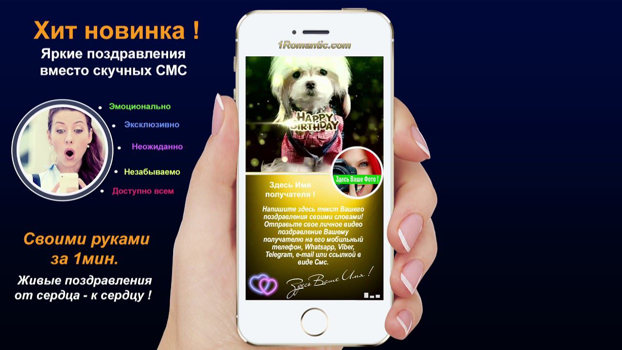 ЗАПОЛНИТЬ ЭТУ ОТКРЫТКУ СЕЙЧАС: https://1romantic.com/musicalnye-pozdravleniya/schaste-ryadom/ Дорогие друзья! Вам остаётся только, написать нужный вам текст и загрузить свою фотографию. 1Romantic.com Является первым и единственным в мире сервисом интерактивных видео поздравлений. Мы используем собственную уникальную технологию, добавляя ежедневно самые новые и последние разработки программирования. У нас Вы можете найти поздравления на любой вкус, только высокого качества и разрешения. Согласитесь, всегда приятней, отправить поздравления от себя лично, чем пересылать чужие, с уже заготовленным стандартным и быстро мерцающим текстом, как рекламный баннер, пересылаемый друг-другу от тысячи к тысячам где нет Ваших Имён. Задумайтесь ! Это выглядит слишком наивно и как минимум глупо, особенно для людей которые умеют писать и читать (на мою розочку сверкалку или стикер и отвали). Теперь всё будет иначе ! Вы можете сами передать своё настроение, тем людям, которым Вы будете адресовать своё поздравление. Теперь Вы сами, творец, художник и поэт своих чувств, наполняя видео открытку своими словами, излучая только самое доброе, искреннее из своих тёплых сердец. Загрузить свою любимую фотографию или фотографию получателя, что безусловно, будет гораздо приятней и неожиданней для него) Безусловно, мы подумали и о музыкальном оформление. Наверняка, Вы будете подбирать нужные слова и фотографию под ту песню, которую Вы захотите загрузить сами, а не ту которую Вам навязывают. Ну и самое главное, Вы можете использовать функцию добавления своего голоса, программа сама наложит Ваш голос на начало загруженной песни. Поверьте это очень оригинально, особенно если Ваш друг не слышал Вас долгие годы. Такое поздравление можно сделать действительно за 30-60 сек. Но если Вы творческий человек, оно не отпустит Вас так быстро))) И Вы будете думать, сочинять, плакать, улыбаться, восхищаться, раскрыв в себе новые таланты... возможно это станет Вашим первым собственноручным творением . Удачи Вам ! С уважением, Ваши Романтики ! Краткий список предлагаемых нами поздравлений... Поздравления с днем рождения женщине. Поздравления с днем рождения мужчине. Поздравления с днем рождения другу. Поздравления с днем рождения подруге. Поздравления с днем рождения для детей. Поздравления с днем святого Валентина. Поздравления Папе. Поздравления с днем рождения Маме. Прикольные поздравления. Видео поздравления с днем рождения. Музыкальные поздравления с днем рождения. Слайд-шоу с днем рождения. и многое-многое другое.