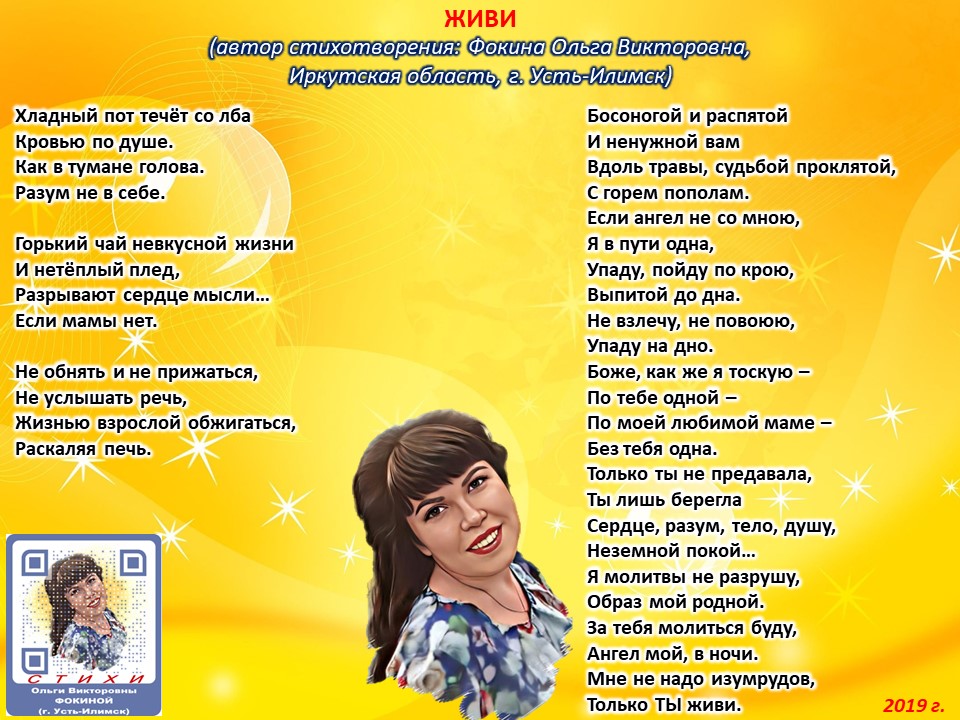 Читает автор стихотворения: ФОКИНА ОЛЬГА ВИКТОРОВНА (Иркутская область, город Усть-Илимск) СТИХИ: https://stihi.ru/2018/07/08/3790 БИОГРАФИЯ: http://www.proza.ru/2019/10/08/1473 ВЫИГРЫВАЙТЕ КНИГИ БЕСПЛАТНО: https://proza.ru/2017/09/17/447 ОТЗЫВЫ ЧИТАТЕЛЕЙ: http://www.proza.ru/2019/11/29/611 Из книги Фокиной Ольги Викторовны (Усть-Илимск) «Несу добро в ладошках!»: [все стихотворения с 2005 по октябрь 2020 гг., проза, авторские песни, интервью]. – Москва: МГО Союза писателей России, 2020 г. – 886 стр., ил. ISBN 978-5-7949-0826-8 ЖИВИ (автор стихотворения: Фокина Ольга Викторовна, Иркутская область, г. Усть-Илимск) Хладный пот течёт со лба Кровью по душе. Как в тумане голова. Разум не в себе. Горький чай невкусной жизни И нетёплый плед, Разрывают сердце мысли… Если мамы нет. Не обнять и не прижаться, Не услышать речь, Жизнью взрослой обжигаться, Раскаляя печь. Босоногой и распятой И ненужной вам Вдоль травы, судьбой проклятой, С горем пополам. Если ангел не со мною, Я в пути одна, Упаду, пойду по крою, Выпитой до дна. Не взлечу, не повоюю, Упаду на дно. Боже, как же я тоскую – По тебе одной – По моей любимой маме – Без тебя одна. Только ты не предавала, Ты лишь берегла Сердце, разум, тело, душу, Неземной покой… Я молитвы не разрушу, Образ мой родной. За тебя молиться буду, Ангел мой, в ночи. Мне не надо изумрудов, Только ТЫ живи. 20 февраля 2019 г.
