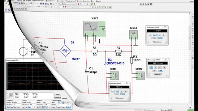 Сегодня займемся мы блоком питания и я не много расскажу вам о нем. Питается он переменным напряжением 16 вольт и частотой 50 герц. Все это хозяйство у нас приходит на диодный мост D1, где выпрямляется четырьмя диодами марки 3N247. Затем у нас идет на разветвитель, где одним концом у нас напряжение поступает на вход осциллографа, а другими проводниками идет на резистор R1 сопротивлением 6 Ом и электролитический конденсатор С1 идущий на землю. Далее у нас идущее с резистора R1 напряжение поступает на измерительный стабилитрон D2 где производится стабилизация напряжения на стабилитроне BZW03-C10 Где отображается на цифровом индикаторе мультиметра и равна 18.24V. Переключаемся на R2 с которого у нас напряжение приходит на R3 где оно понижается и отражается на цифровом индикаторе ХММ2 и равно 149.732 мА и подключается на общую землю вторым концом провода. Переходим вверх по схеме на которое у нас приходит с разветвителя R2, R3, ХММ3 и осциллографа ХSC1 на котором отражено показание мультиметра ХММ3 и равно 14.793В. И последнее переходим к осциллографу, и видим две пилообразные формы отражающие напряжение, на одной из них форма сигнала изображена оранжевым цветом это напряжение идущее с диодного моста. Ну а вторая осциллограмма показывает идущее напряжение с R2 и R3.