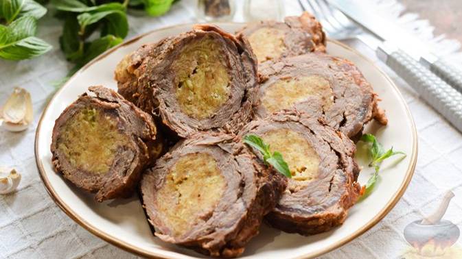 РУЛЕТ ИЗ ГОВЯДИНЫ С СЫРОМ, ЗАПЕЧЁННЫЙ В ТОМАТНО-ВИННОМ СОУСЕ